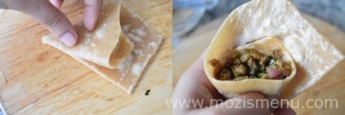 - Fold the pastry sheet as shown in the picture below and fill 1 tsp of chicken keema and apply the maida paste on the edge and slide it inside(if it is hard to slide inside, fold it on top.) Make sure it doesn’t have any openings for the oil to get into the filling.