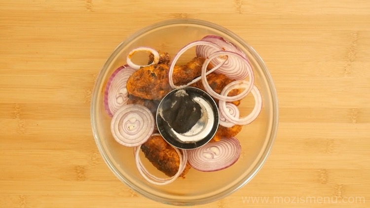 - Place the sliced onions along with the cooked chicken in the bowl, and then place a small steel cup over the chicken.